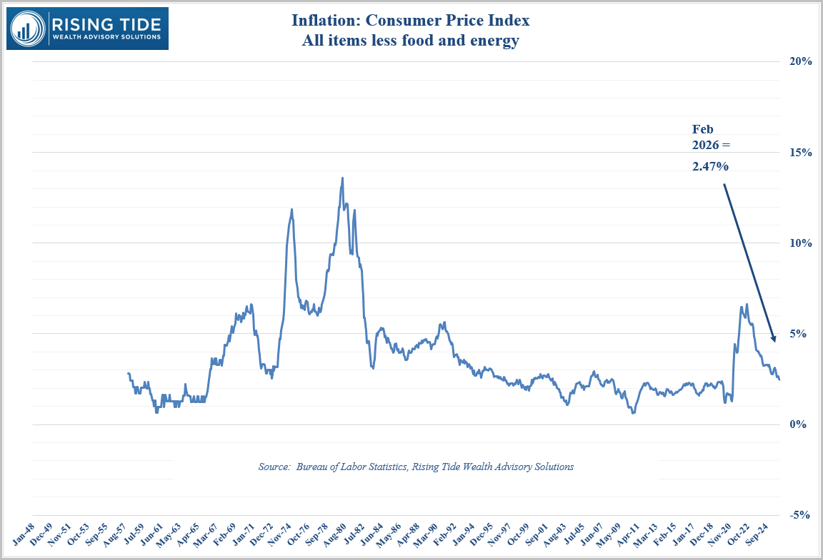 Inflation continues to trend in the right direction, though with new risks emerging. The February CPI report showed continued progress, but the recent spike in oil prices is likely to create upward pressure in the months ahead as energy costs feed into transportation, manufacturing, and ultimately consumer prices.