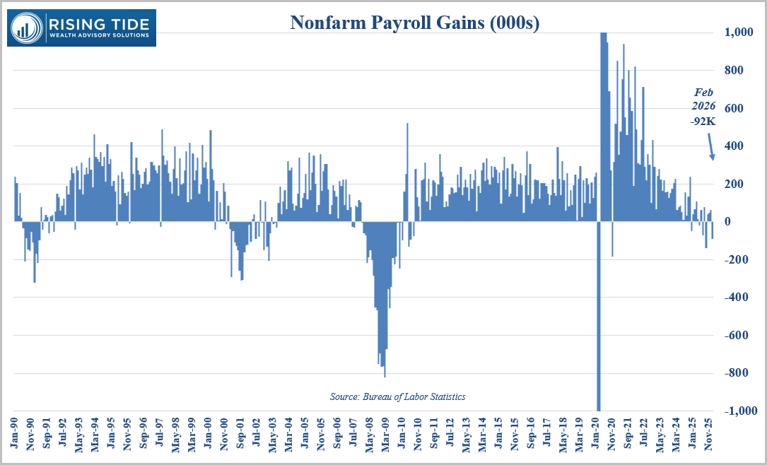 While markets have been volatile, the economic data paints a picture of a cooling economy. The labor market has clearly softened over the past year. February nonfarm payrolls declined by 92,000 jobs, marking the fifth negative reading in the past 14 months while the unemployment rate ticked higher to 4.4%. Losses were concentrated in leisure and hospitality, as well as healthcare. This suggests a labor market that is no longer robust, but not necessarily collapsing.