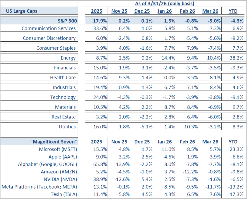 Energy was the clear standout. The sector rose 10.4% in March and is now up 38.2% for the year, driven by rising oil prices. Outside of energy, weakness was broad during the month. Healthcare and Industrials each fell more than 8% in March, and the Magnificent Seven extended their declines. Mid cap and small cap stocks offered little diversification benefit, with both segments down roughly 5% during the month.