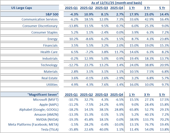 U.S. equities finished 2025 on a strong note, with solid Q4 gains capping a year supported by resilient growth, easing inflation, and fading recession fears. The S&P 500 rose 2.7% in Q4 and 17.9% for the year, ending near record highs as leadership broadened beyond mega-cap tech. Health Care and Communication Services led late-year gains, while Industrials and Financials benefited from steady activity and stable credit conditions, and rate-sensitive Real Estate lagged under high financing costs. Although mega-cap technology and AI leaders defined much of the year, their dominance eased in Q4 as valuations cooled, value stocks outperformed growth, and market breadth improved meaningfully, reflecting an economy that slowed but did not stall and setting a constructive backdrop entering the new year.