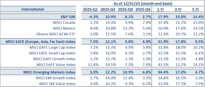International equities posted outsized gains in 2025, decisively outperforming the U.S. after years of lagging as global growth stabilized, energy prices fell, and earnings recovered. Developed markets surged, led by Europe and Japan, where industrials and financials benefited from normalization and expanding margins, while emerging markets advanced on reform momentum, commodity strength, and a global tech upcycle, including a stimulus-driven rebound in China. Overall, 2025 underscored the value of global diversification, with non-U.S. equities breaking out and signaling a broader, healthier expansion beyond the U.S.